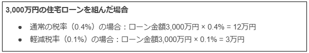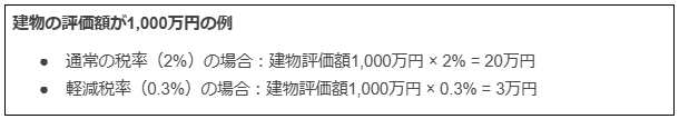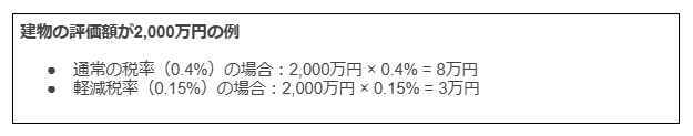 通常の税率は0.4%ですが、一定の条件を満たす住宅に対しては軽減措置が適用され、税率が0.15%に引き下げられます。