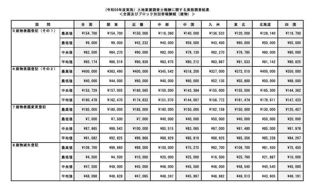 画像出典:(令和04年度実施) 土地家屋調査士報酬に関する実態調査結果. <全国及びブロック別回答報酬額(建物)>