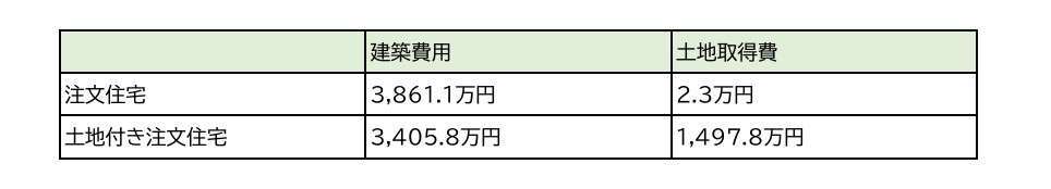 注文住宅の場合、新築平均価格には建築費用と土地取得費が含まれており、その内訳は以下のとおりです。
