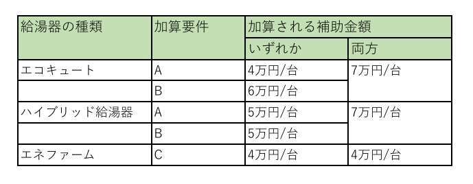 また、それぞれの給湯器に、加算要件が設けられており、要件を満たすと補助額が加算されます。