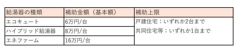 各給湯器の補助金額および上限台数は以下を参考にしてください。