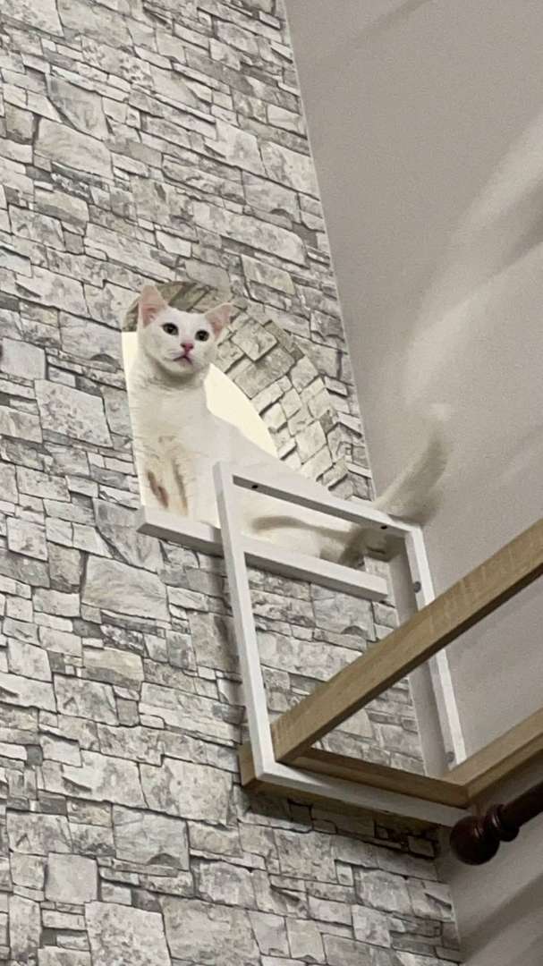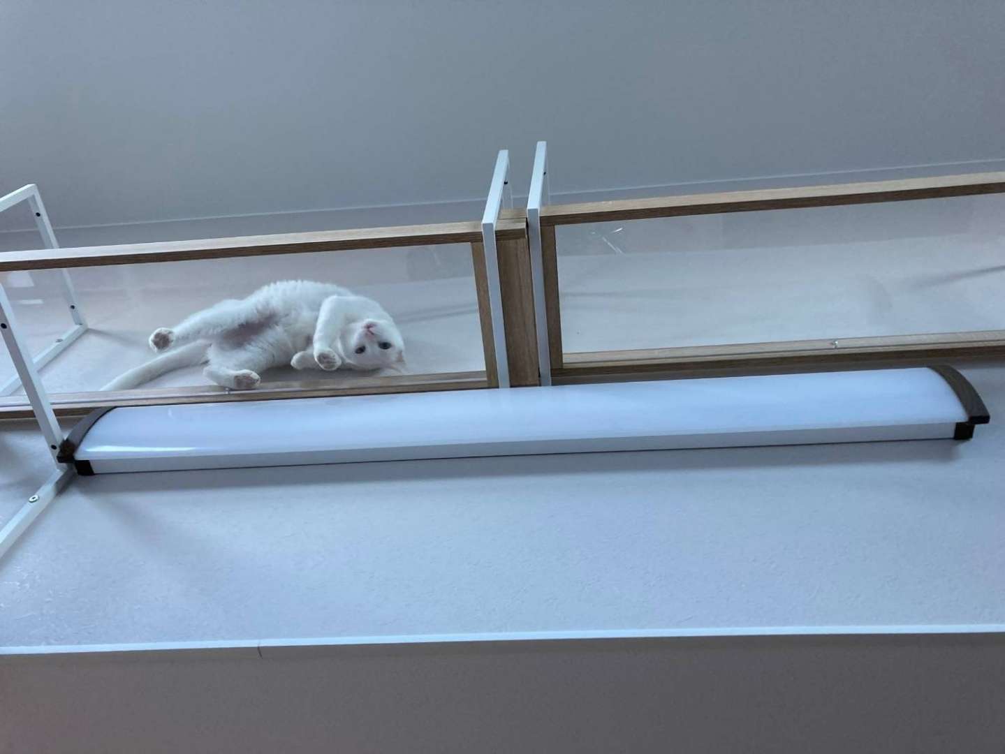T様は樹里ちゃんが寝そべった時のお腹が大好きなので、樹里ちゃんのかわいい肉球と寝そべった時のお腹が見える透明アクリルのキャットウォークを選びました。